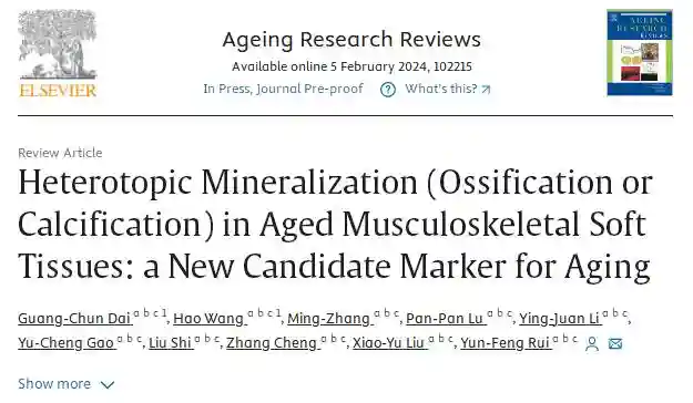 2月5日,东南大学附属中大医院芮云峰教授课题组在国际老年医学权威期刊《AgeingResearchReviews》(IF=13.1,中科院一区,TOP期刊,非OA)发表题为“HeterotopicMineralization(OssificationorCalcification)inAgedMusculoskeletalSoftTissues:aNewCandidateMarkerforAging”的综述论文。论文提出异位矿化(HM)可作为骨骼肌肉软组织系统老化新候选标志物这一概念,有望成为骨骼肌肉软组织老化防治靶点和未来研究新的焦点。