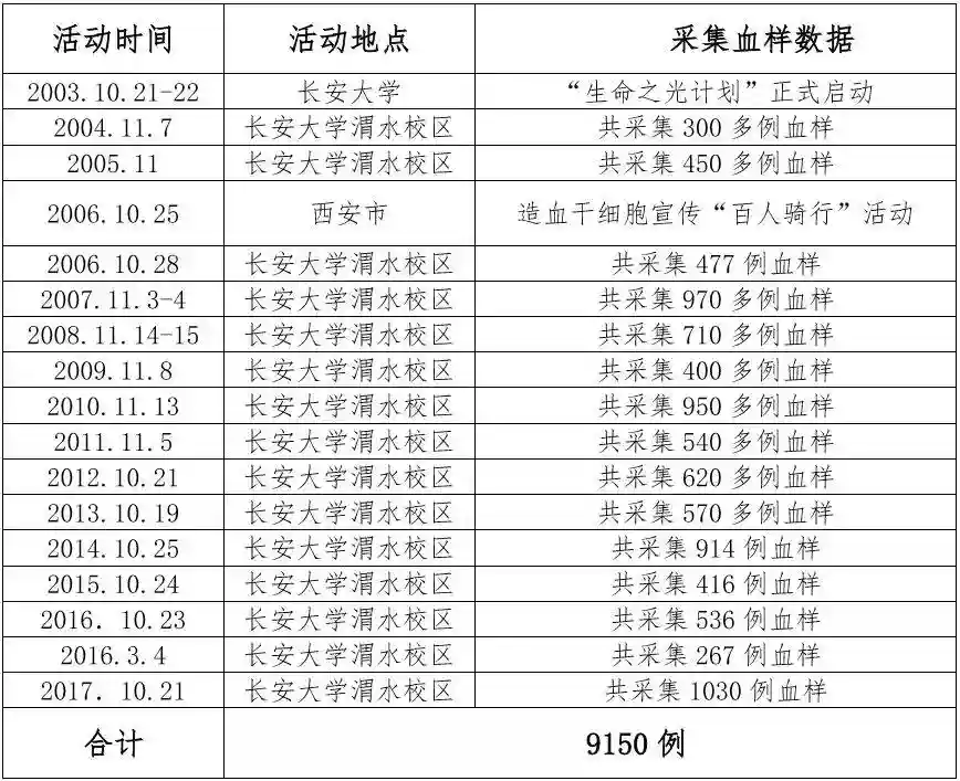 “生命之光计划”——造血干细胞血样采集与宣传活动是希望阵营与陕西省红十字会共同举办的大型公益活动。自2003年启动以来在长安大学校内外开展了广泛的宣传并协助建立中国造血干细胞捐献者资料库陕西分库,总计为陕西分库提供了9150份血样。截止目前,已有27名长大爱心学子成功捐献造血干细胞。