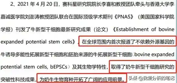 除了控股股东较强外,公司技术也是领先的。今年上半年,和李嘉诚医学院一起,在国际顶尖的期刊上,首次发表了不依赖外援基因的一项牛的干细胞育种技术,公司的技术,可以让这些干细胞在长期培养中繁殖旺盛,允许精确的基因组编辑,可以让奶牛育种的品质和速度大幅提高,并可以应用在其他哺乳动物上。