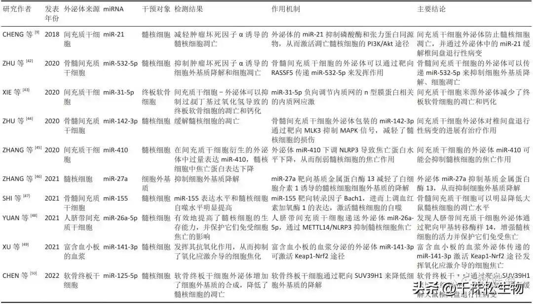 外泌体miRNA在椎间盘退行性病变修复中的作用机制汇总表
